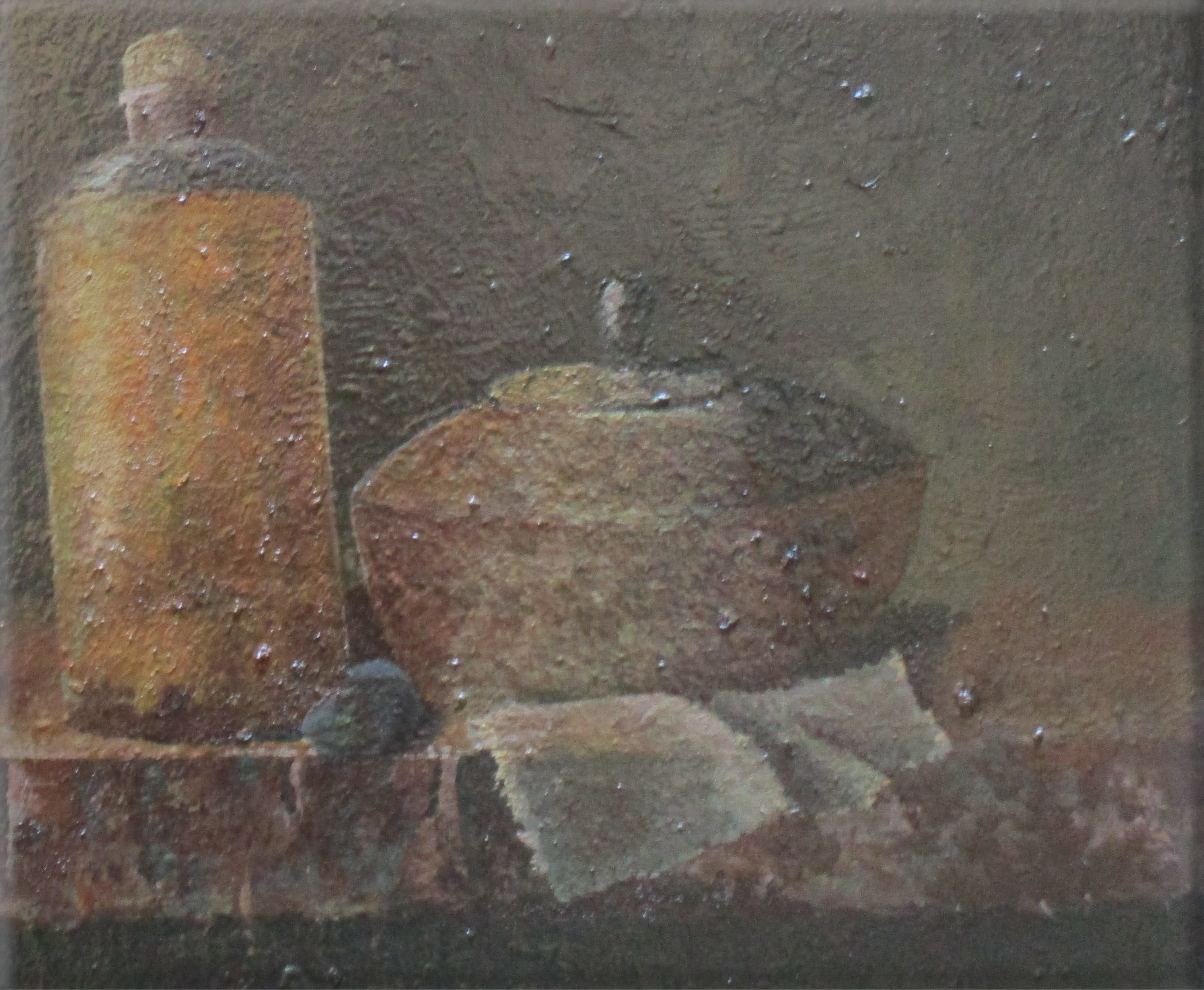 Shrouded Hills Hospitality is a still life that captures a humble collection of vessels—bottle, bowl, cup—set against a weathered backdrop that speaks of age and use. The subdued palette of ochres and umbers, paired with the rough surface and soft lighting, evokes a timeless domesticity. Each object, though ordinary, is rendered with reverence, inviting the viewer to linger in the quiet dignity of the everyday.