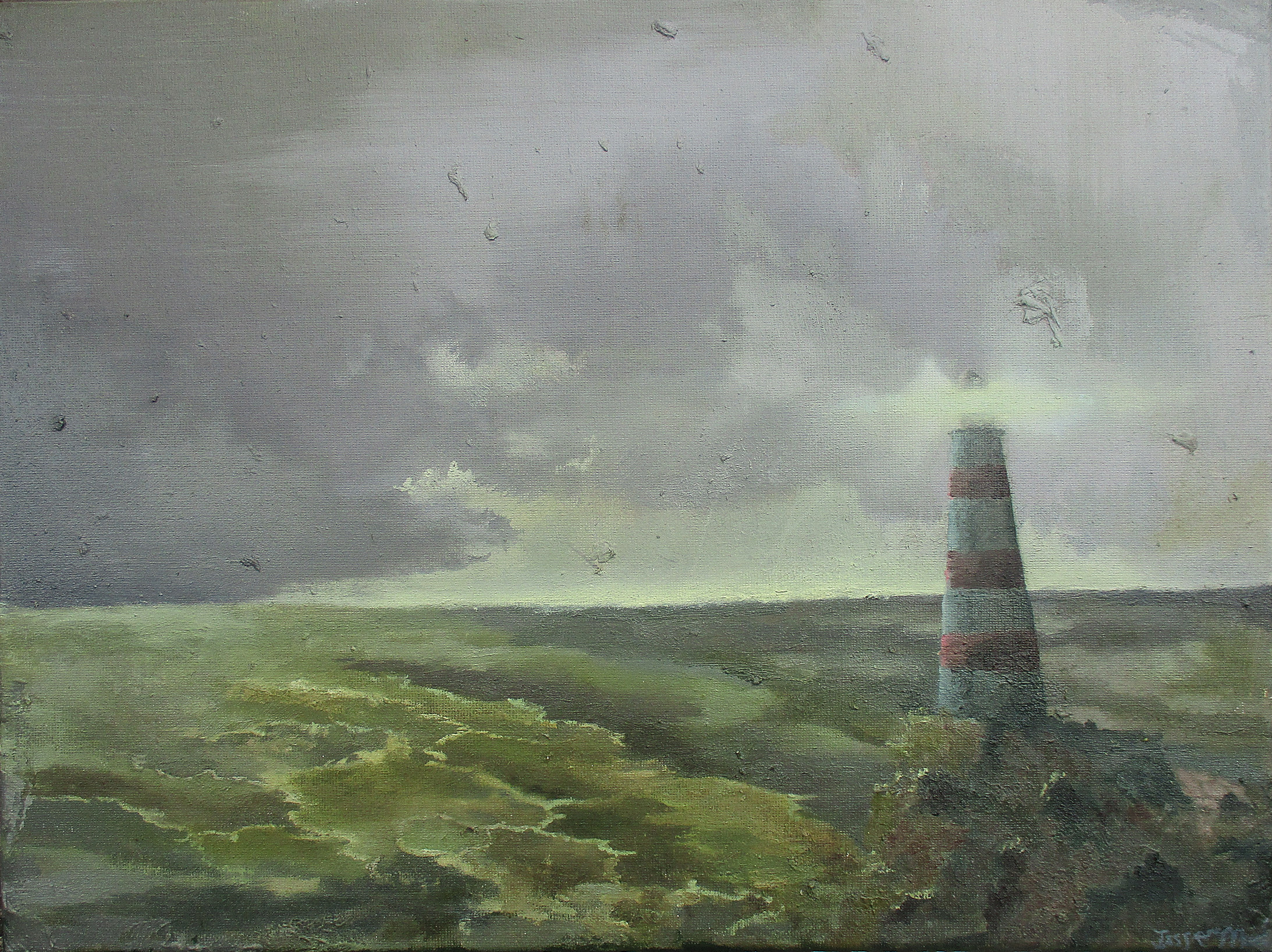 In the midst of a sprawling, desolate marshland, a solitary tower stands as a silent sentinel against the encroaching storm. The sky, heavy with dark, brooding clouds, casts a sombre pall over the landscape, while the tower's red and white stripes offer a stark contrast to the muted greens and browns below. This scene captures the raw, untamed beauty of nature, where the elements reign supreme and human presence is but a fleeting whisper.