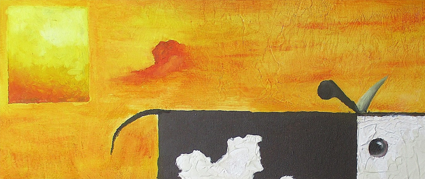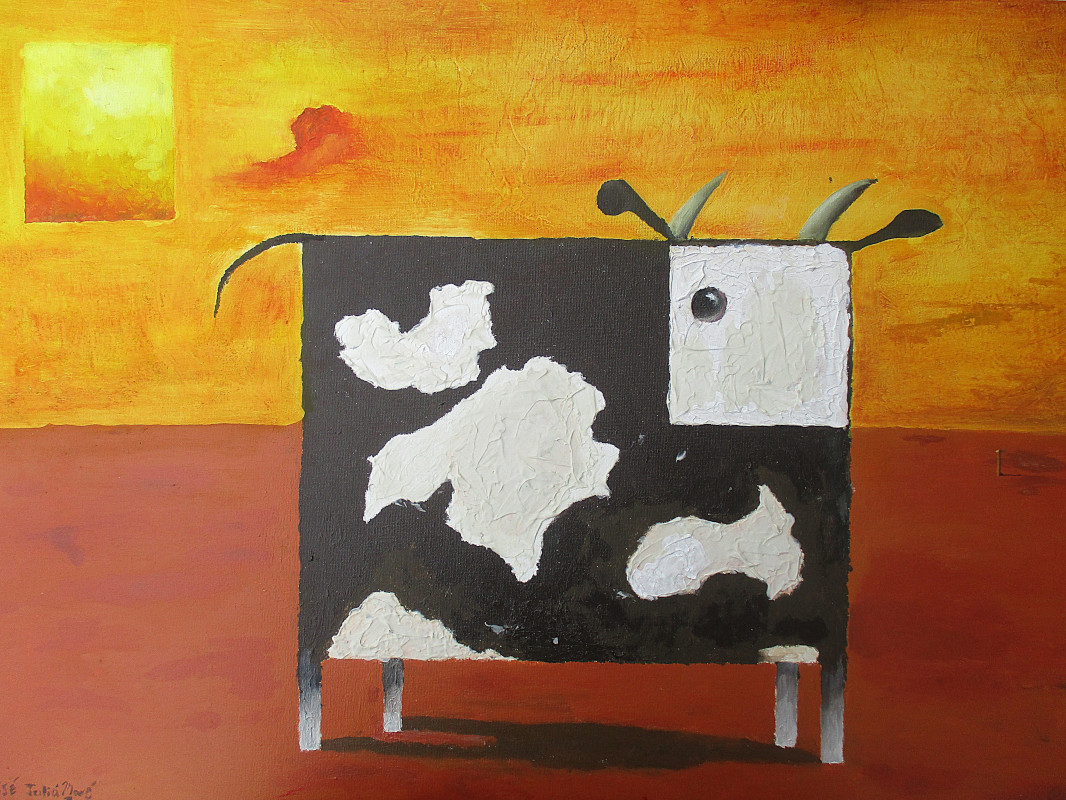 This painting is a portrayal of a cow, rendered with a blend of geometric simplicity and vibrant colour contrasts. The background is a division of warm, fiery orange and earthy brown, evoking a sense of both warmth and grounding. The cow itself is a bold, rectangular form, predominantly black with white patches, standing with an almost statuesque presence on slender, delicate legs.